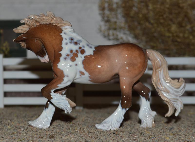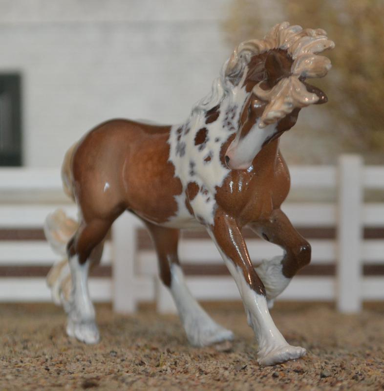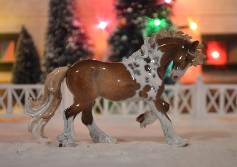 Another resin Christmas ornament! I just love working on these guys, the resin is custom~friendly, and they have a lot of detail to work with. Plus it is a mold not released in a mini size normally! This fellow has had some face and ears work done, plus some mane and tail enhancements. The feathering leads me to think Shire cross or Vanner, so that’s what I went with…add a super cool creamy red chestnut tobiano, this stallion will never get overlooked in the breed ring! Super gloss finish, looks clinky, but not! $475.00