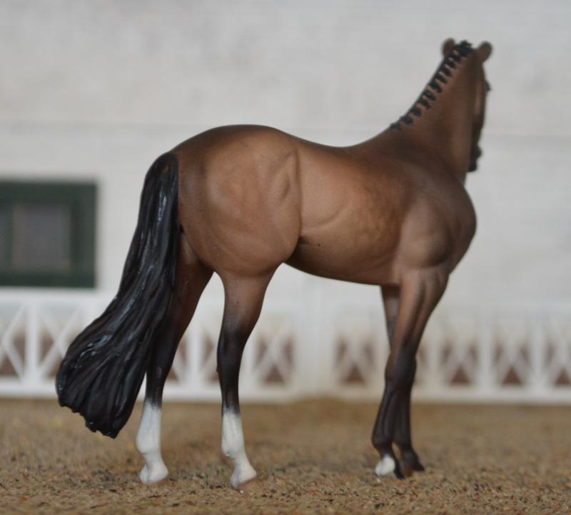 Custom Breyer Stablemate Resin Warmblood~another Ornament! This one is the Winx mold shrunk down. Sadly, his head doesn’t reduce well, so he had to have a complete face~lift, including new ears, a slight extension of the neck, and a head tuck ‘n turn. I think he makes a perfect Trekhaner! Also sports a hunter braided mane, and a fuller tail. Painted a light dapple mousy bay with just enough chrome. Something different for the sporthorse mini division! Really elegant. $475.00