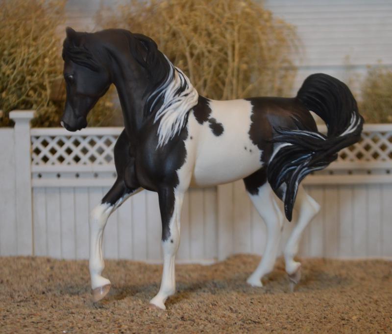 Now a stunning half Arabian Pinto mare. Redone head and neck, with new ears, and a custom mane and swishy tail. All her legs have been modified, and she now has a clear peg under her hind foot. Mulberry undertones on this dapple black paintjob. Super pretty!