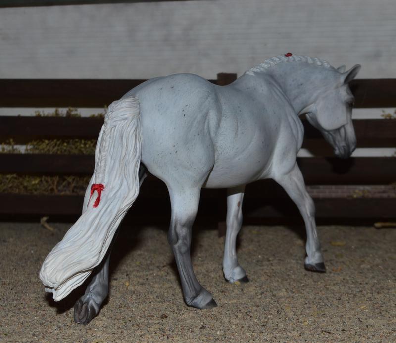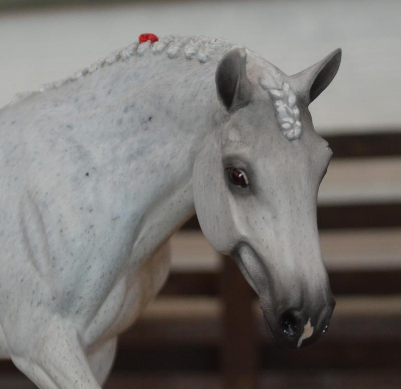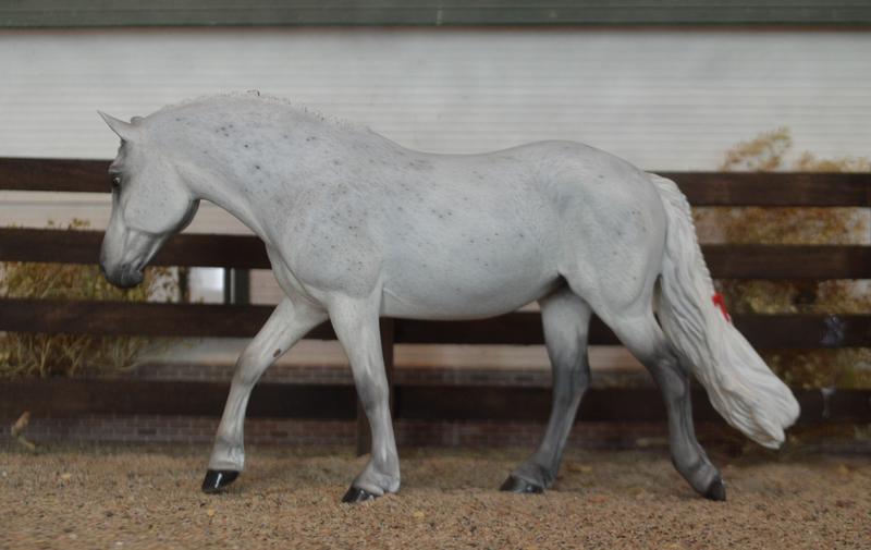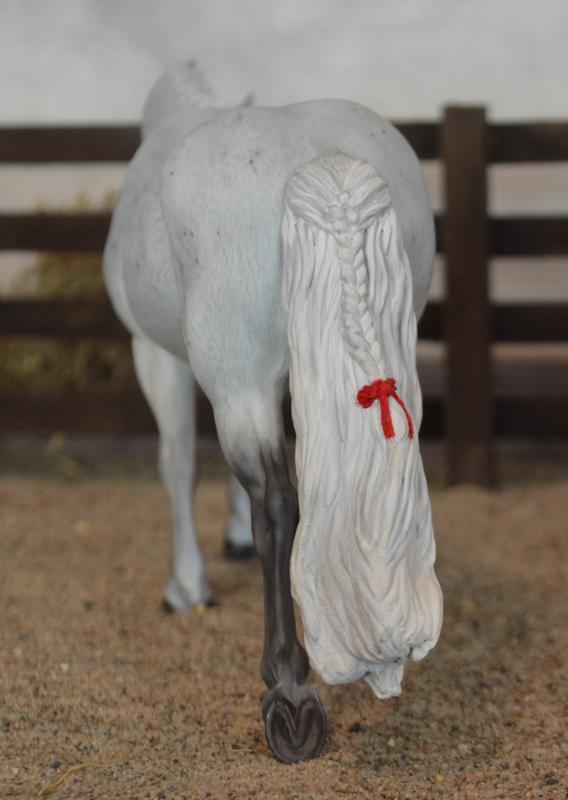 Now a fancy Welsh Hunt Pony! Modified head and neck, mane removed and replaced with big fat pony braids. New tail with an extra little plait-red bow in the tail, and a red cheater braid in the mane. Painted a mega-flea bit grey, she’d look great with a kid rider…this one is available (please inquire)