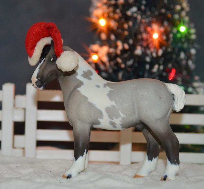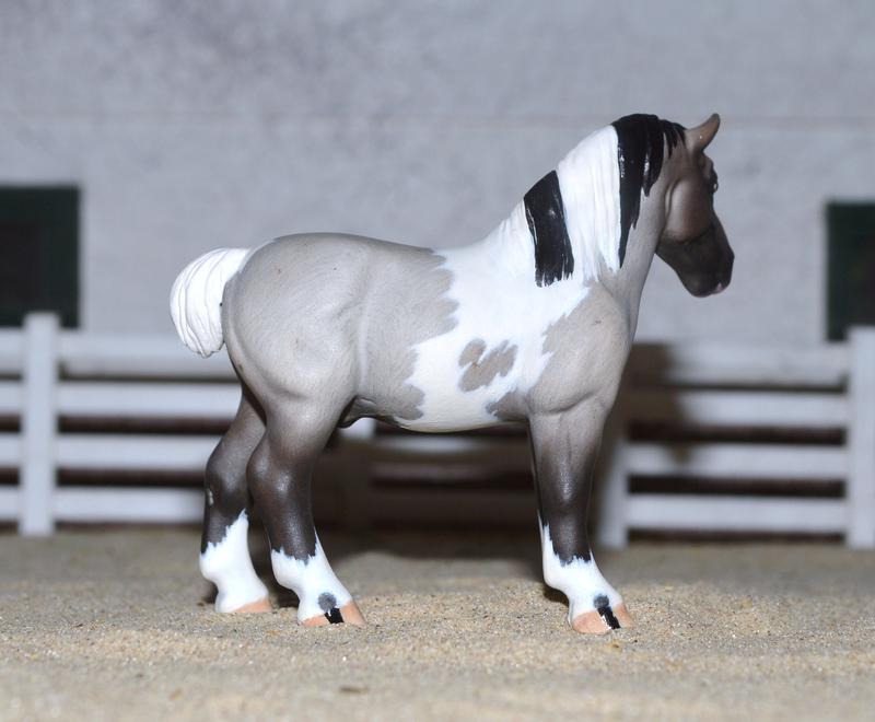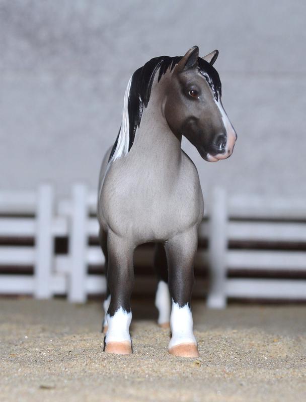 This is the new mold, which is so much fun to work with! He’s had his head tucked and turned, with new alert ears. He has a new mane and tail, both are bob-friendly, so can be added at no charge if buyer wants, just choose your colour. He’s been painted a blue roan tobiano with some corn spots, pretty fancy little gelding. $375.00