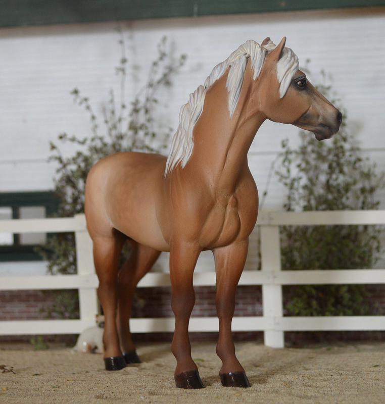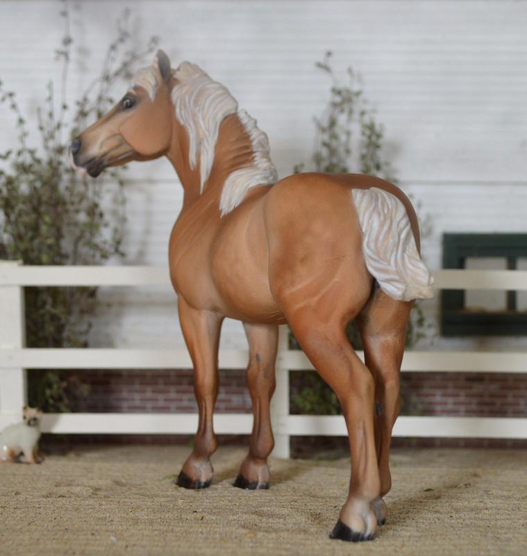 This is one of my sculpts, limited to a run of 25. This one has been heavily customized, with a re-done head and neck, beefier barrel and topline, and a custom thick mane and swishy tail. A true one of a kind. He has been painted as a Belgian, soft and creamy chestnut colour. $475.00