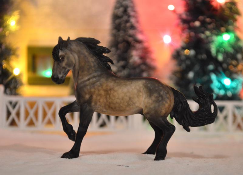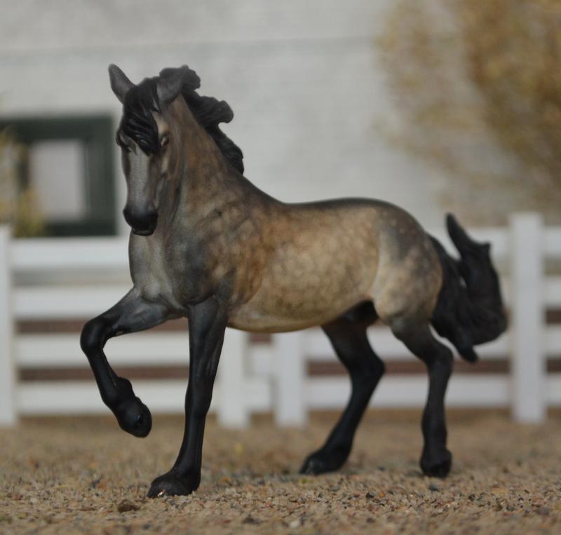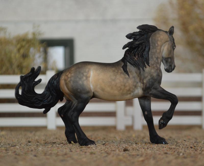 Custom Breyer Stablemate Fireheart~now a super fancy Connemara Stallion. He has a head tuck and turn, with new ears, and an embellished mane. All his legs have been cleaned up, and he is painted a deep, dark, smutty, dapple buckskin. No white because he doesn’t need it! $475.00