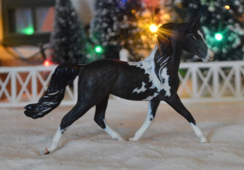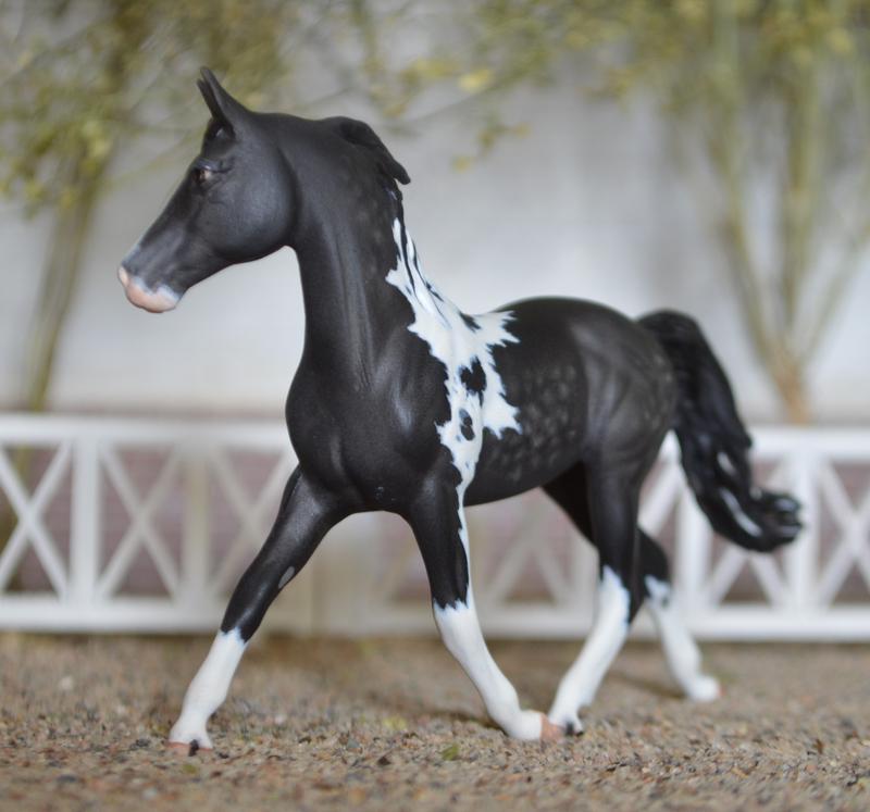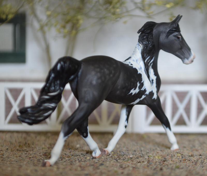 Super flashy, super pretty! Performance friendly custom mane, free flowing custom tail. Head turned, with new ears and face detailing. Legs slightly modified and cleaned up. Finished with a dapple black pinto colour, she is a head turner! $425.00
