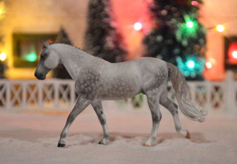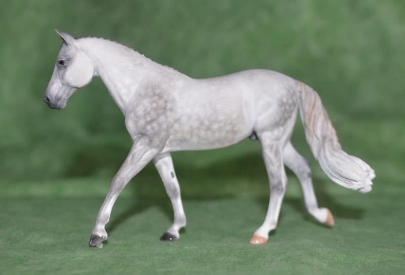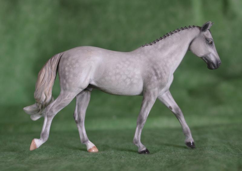 From the trotting mold…really cute with some work! A lovely little performance mare. She has had her head resculpted, with new ears, plus a hunter braided mane. All her legs have been modified and detailed, and she has been painted a medium dapple grey. $400.00