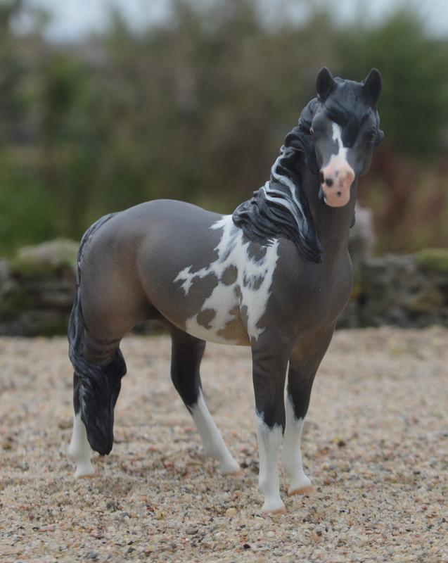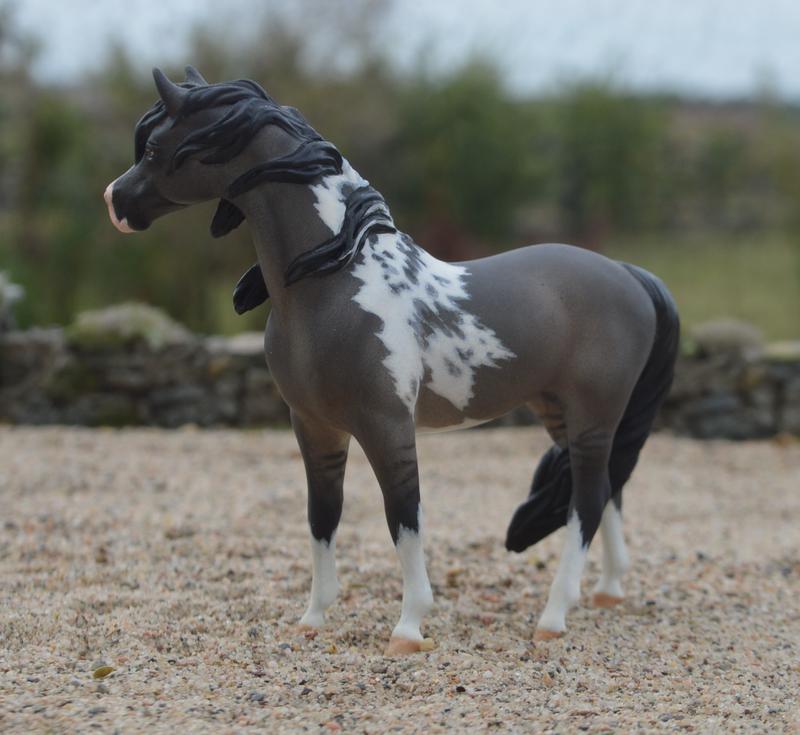 From the mini Swaps mold, I so enjoy customizing the stablemates from the 80s. She has had her head turned, with new ears and muzzle. Legs have been slightly modified, add to that a custom full blowing-in-the-wind mane and tail…topped off with a grulla tobiano paint job. She is majestic! $400.00