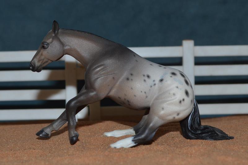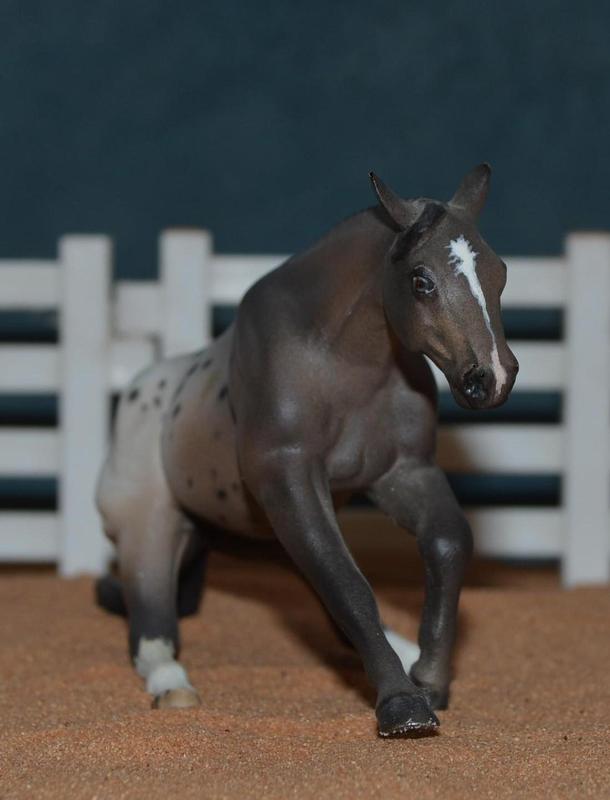 A super cute little varnish Appaloosa working horse! All his legs have been modified, new ears and a detailed out head. He now has a roached mane, and a custom tail…a really fun mold! $350.00