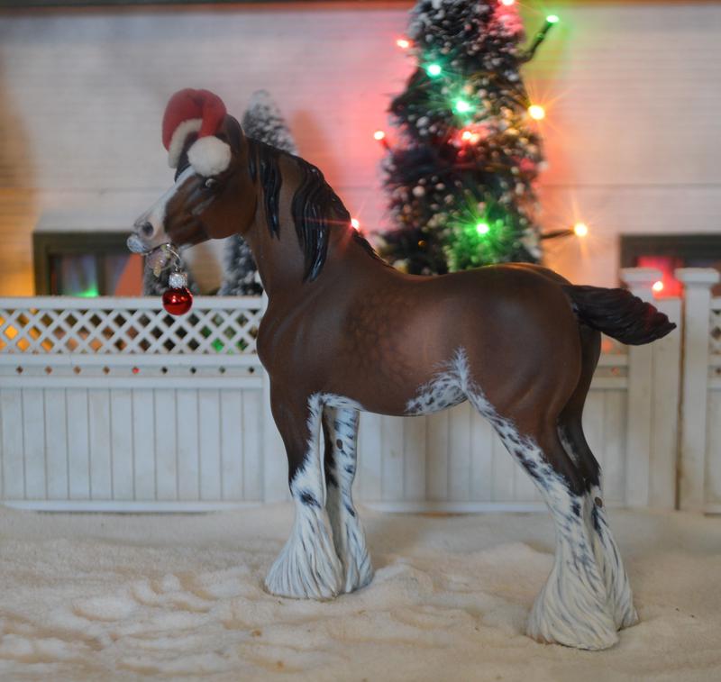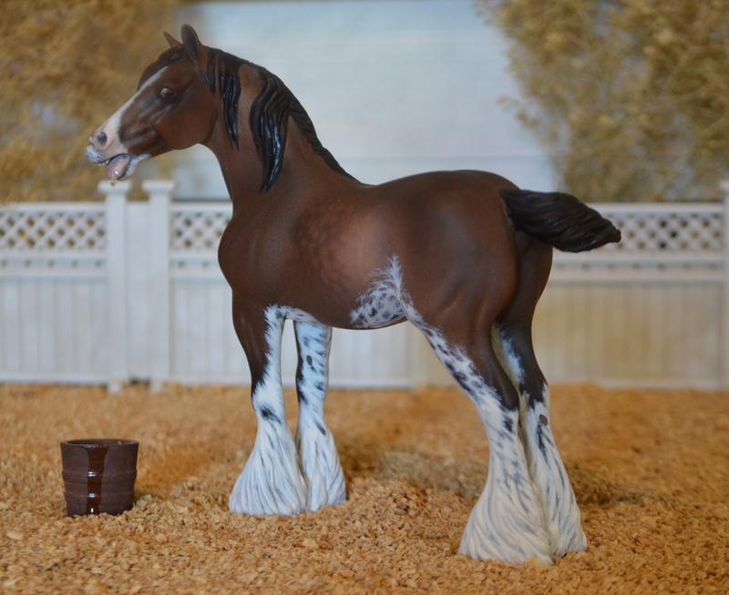Custom Breyer Breeds Of The World Resin Drafter~Pebbles scale, this young Clydesdale is fashioned from the Classic Artist series, the Leonardo De Vinci standing draft horse. He has had all his legs modified, with lots of feathering added; he also has had his head turned and lowered, with all new re~sculpting of the face and ears. He is now drooling water from dipping his nose in a bucket for a drink. He is painted a red dapple bay, with plenty of sabino chrome. Ready for the mini custom division at Breyerfest! $650.00