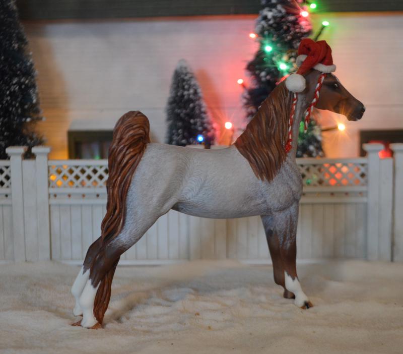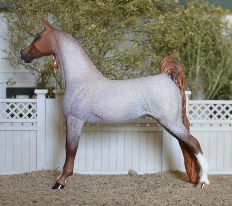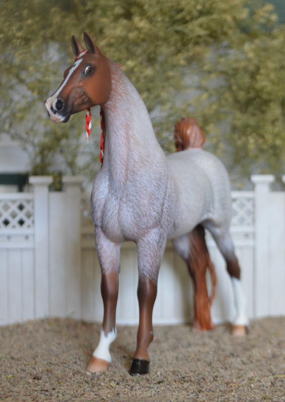 I just love this mare! Slight change to headset-newly re-done head and ears. Legs cleaned and detailed, with tidy country shod feet. Customized mane and tail. Painted a strawberry roan with chrome-really a stunner.