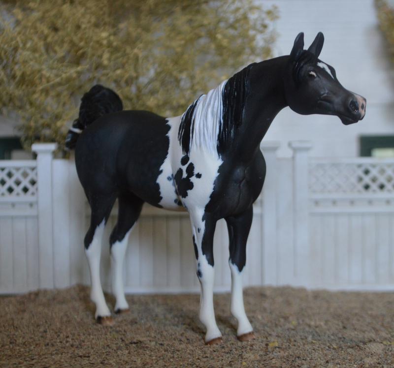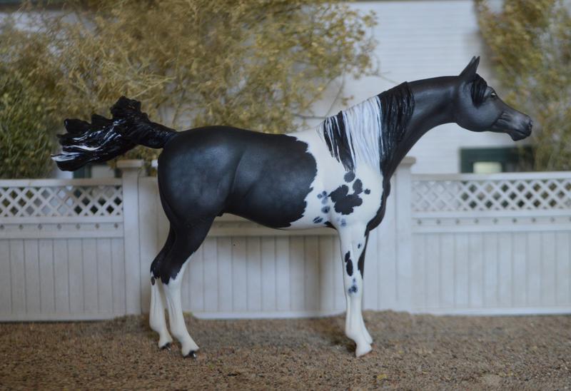 My sculpt, modified! Had some fun with this little mare, straightened and lengthened the neck, redid and refined her head and ears, modified all her legs, plus detailed out ankles, heels, and hoofs. New custom mane, and flippy tail…topped her off with a dapple black tobiano colour, super flashy! She is something truly different! $525.00