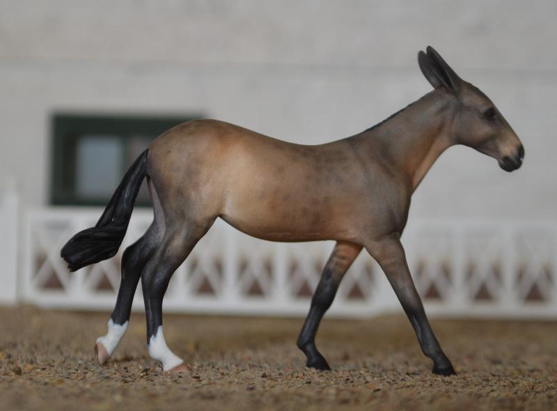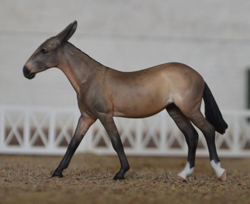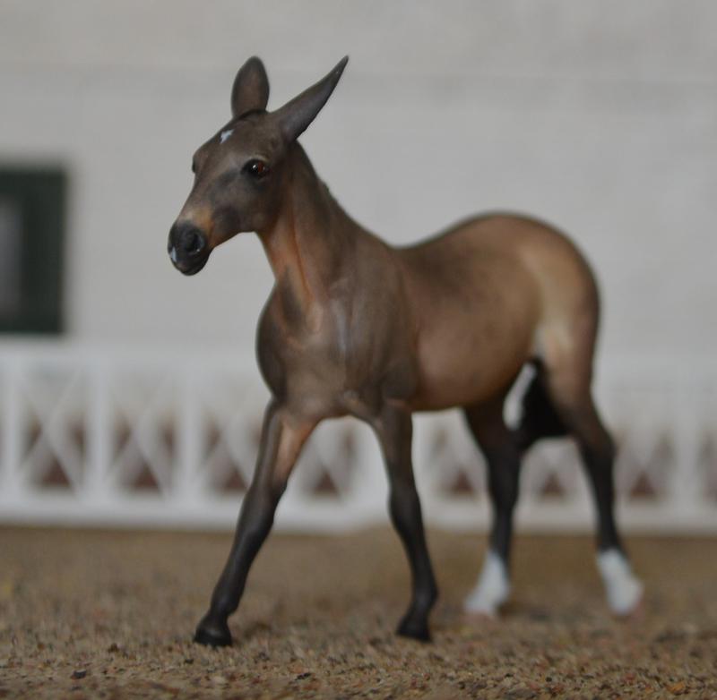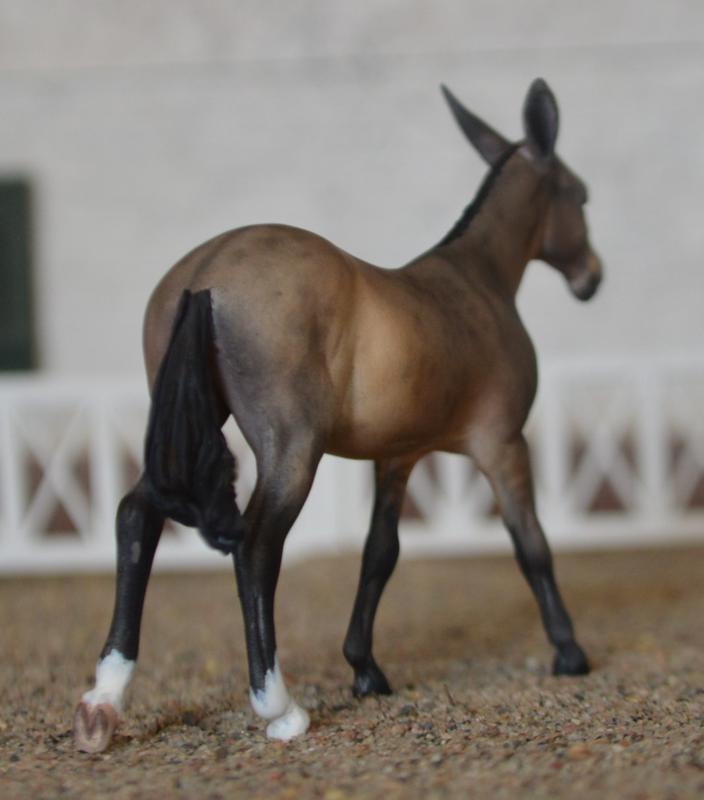 Custom Chips Mule~A no~nonsense performance mule. This little molly can do it all-harness, Western, English…looking for a mini for every division? Here ya go! Modified all her legs a bit, detailed out her head, and gave her new ears. She has been painted a standard mule dun, with primitive leg barring and reverse dapples. Two hind socks and a teeny tiny star. I do not have many chips mules left to customize, grab her while you can!